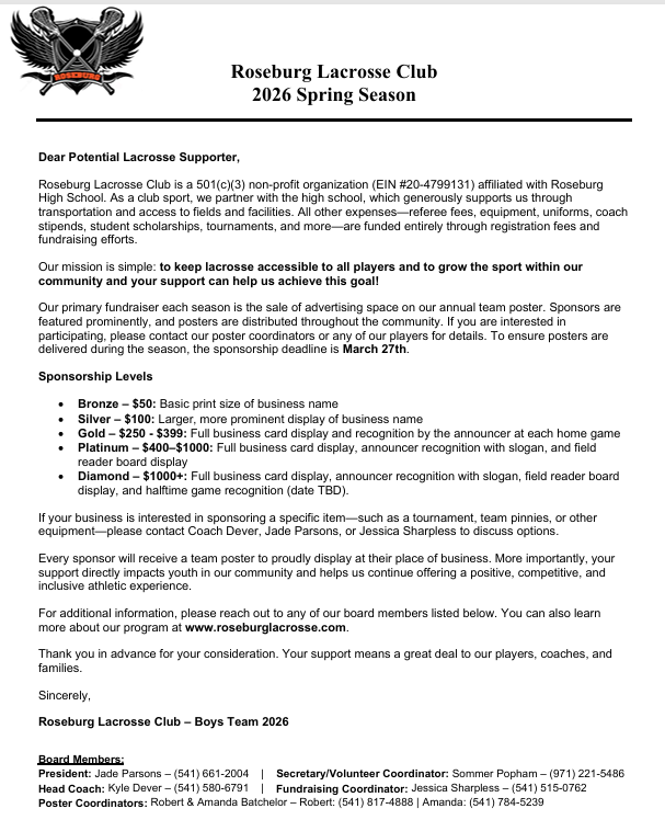Thank you for continued support of Roseburg Lacrosse. Each registered player is required to participate in fundraising activities. The club continues to work to make the sport accessible for all players and this is done through the thoughtful donations of our community. In order to distribute posters to sponsors before the end of the season we ask that sponsor submissions are completed by March 27th.
