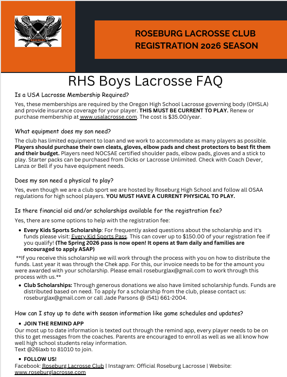 - Current physical on file with RHS. (Do not send physicals to Roseburg Lacrosse).
